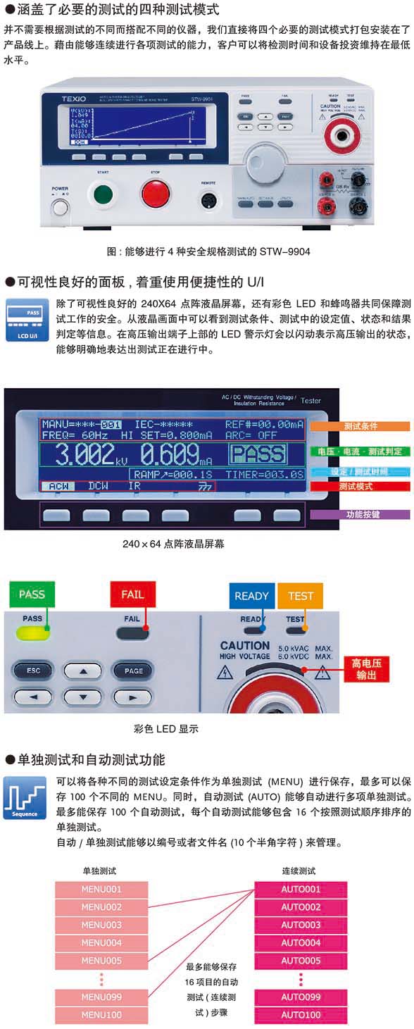 STW-9800/9900系列電子安規測試儀,使用200VA/500VA容量的變壓器,采用PWM開關放大器,具有四種(AV耐壓,DC耐壓,絕緣阻抗,接地阻抗)規格測試,還有多種在單獨測試或自動測試中保證安全性優先的功能。